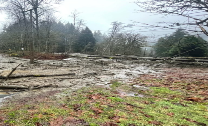 Images from the site show heavy debris—including mud, rocks, and fallen trees—covering the area and impacting power lines.