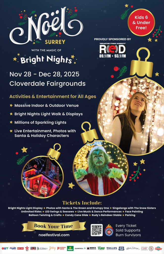 This year, Bright Nights will be featured as part of the second annual Noel Holiday Light Festival, held from Nov. 28 to Dec. 28 at the Cloverdale Fairgrounds. Its homecoming showcases Cloverdale as a vibrant entertainment hub and a premier destination during the holiday season. The light display is produced through thousands of volunteer hours by over 800 firefighters and serves as the single largest annual fundraiser for the BC Professional Fire Fighters’ Burn Fund. A portion of proceeds from Noel Surrey will be donated to support burn survivors across the province.