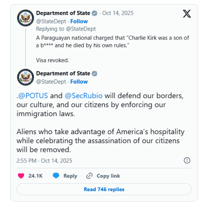 Kirk, 31, was shot and killed at a Turning Point USA rally at Utah Valley University on September 10. The State Department shared screenshots of posts from individuals in Argentina, South Africa, Mexico, Brazil, Germany, and Paraguay whose comments were deemed inappropriate or celebratory of Kirk’s death. Each case was followed by the note “Visa revoked.”