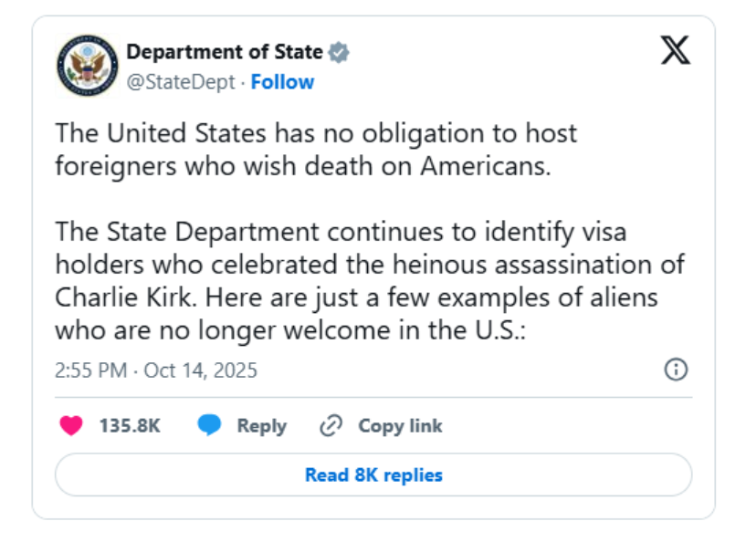 In a statement on X, the department said, “The United States has no obligation to host foreigners who wish death on Americans,” adding that it continues to identify visa holders who “celebrated the heinous assassination of Charlie Kirk.”
