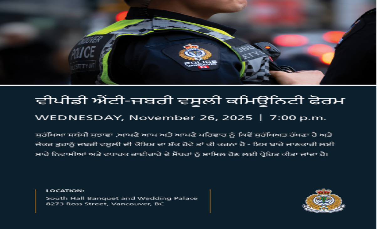 The Anti-Extortion Community Forum will explain what extortion entails, how to recognize warning signs, and what steps to take if someone becomes a target. Although no extortion cases have been reported within Vancouver, the VPD says incidents in neighbouring communities have created fear and uncertainty among Vancouver residents as well.