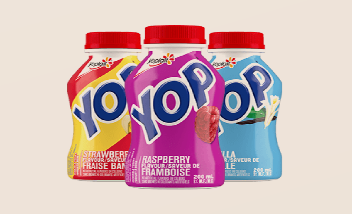 It also applies to multi-packs containing the 200 ml YOP drinkable yogurts, such as the 15-pack of strawberry, vanilla and strawberry-banana; the six-pack of strawberry; the six-pack of strawberry-banana; the 12-pack of strawberry-banana, blueberry, strawberry and raspberry; and the 12-pack of strawberry and vanilla.
