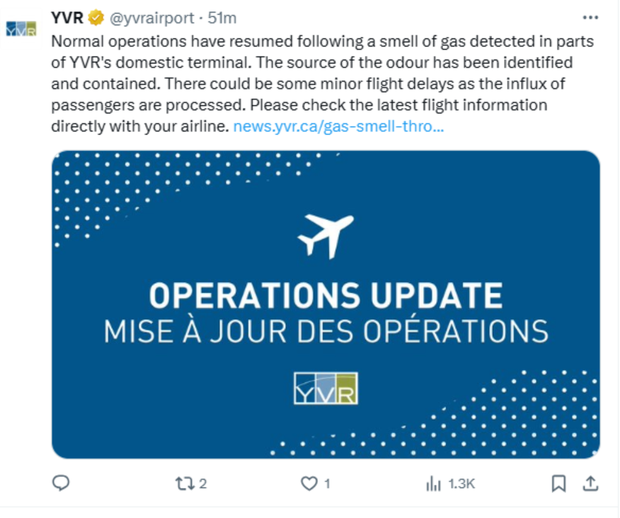 YVR confirmed that RCMP and Richmond Fire and Rescue crews responded quickly, identifying and containing the source of the odor. “There could be some minor flight delays as the influx of passengers is processed,” the airport said in a statement.